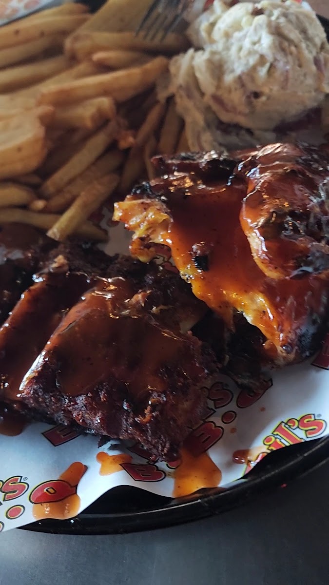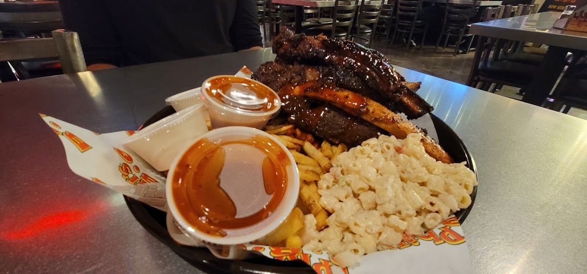 I always get the burger with the pulled pork and onion ring in it and it never disappoints and my hubby got the pork ribs and they were good but nothing compared to the ribs at Jack's BBQ in elsinore. As for the sides the baked beans were good, but they give you really bad gas later. The potato salad I wouldn't get again bc it wasn't good so maybe they need a need recipe for it like my Momma's. The fries were the best side that we got by far they were crunchy and tasted homemade. The only thing your missing is a sample plate like Jack's BBQ has where you can try all the different meats at the same time and share with your partner! The sweet tea was good too eventhough it was the bottom of the barrel bc we went late at night, but the tea is better then Popeyes sweet tea bc it's not too sweet just the right amount of sweetness!